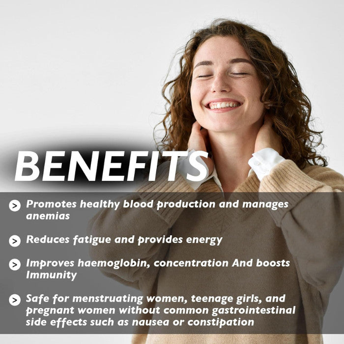 Ideal for individuals with iron deficiency, fatigue, or increased nutritional needs due to menstruation, pregnancy, or plant-based diets, this clean-label formula is non-constipating, easy on the stomach, and free from synthetic additives.