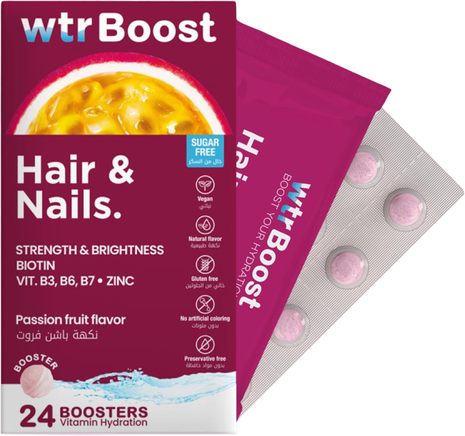 WTR Boost Hair & Nails Hydration, Strength & Shine, Passion Fruit flavor - 24 Tablets