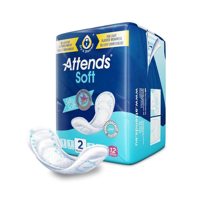 Attends Soft 2 Normal 12's offers a discreet, secure, and comfortable solution for managing light urinary incontinence. Engineered by ATTENDS—a trusted name with over 40 years of expertise in continence care—these small, body-shaped pads are designed for daily confidence. The breathable back sheet and flexible design allow for a natural fit, while an advanced absorbent core ensures reliable protection and skin comfort.