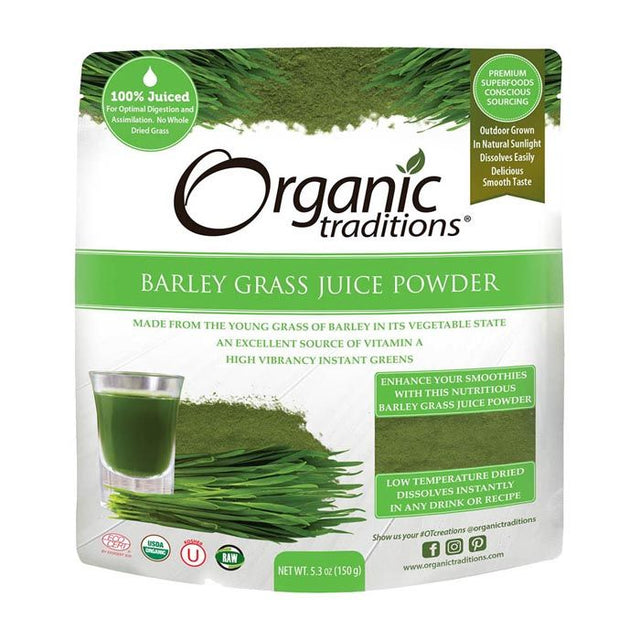 Organic Traditions Barley Grass Juice Powder is made from the young, nutrient-dense grass of barley in its vegetable state. This powerful young green grass contains an abundance of chlorophyll, vitamins, minerals and antioxidants. Our Certified Organic barley grass is sustainably grown outdoors in mineral rich ancient soil beds in sunlight as opposed to indoor plastic trays under artificial light. Grasses grown in the fresh wind kissed by natural sunlight are more vibrant than indoor grown grass. There is a real difference that you can taste and feel!
