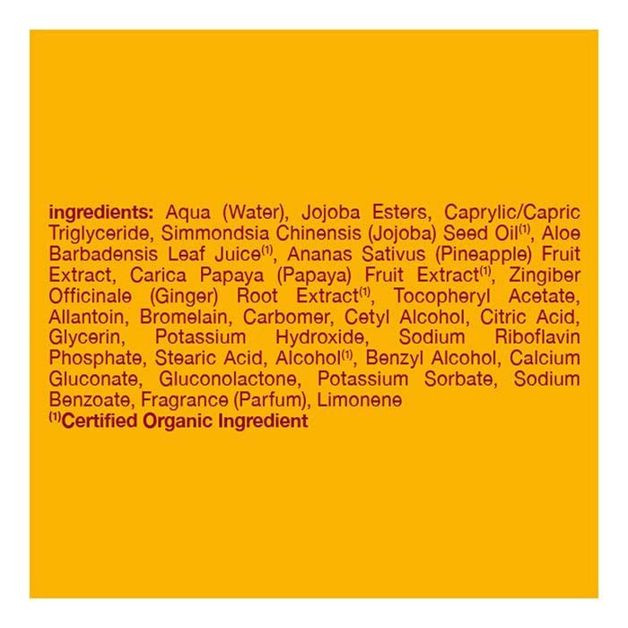 Aqua (Water), Jojoba Esters, Caprylic/Capric Triglyceride, Simmondsia Chinensis (Jojoba) Seed Oil (1), Aloe Barbadensis Leaf Juice (1), Ananas Sativus (Pineapple) Fruit Extract, Carica Papaya (Papaya) Fruit Extract (1), Zingiber Officinale (Ginger) Root Extract (1), Tocopheryl Acetate, Allantoin, Bromelain, Carbomer, Cetyl Alcohol, Citric Acid, Glycerin, Potassium Hydroxide, Sodium Riboflavin Phosphate, Stearic Acid, Alcohol