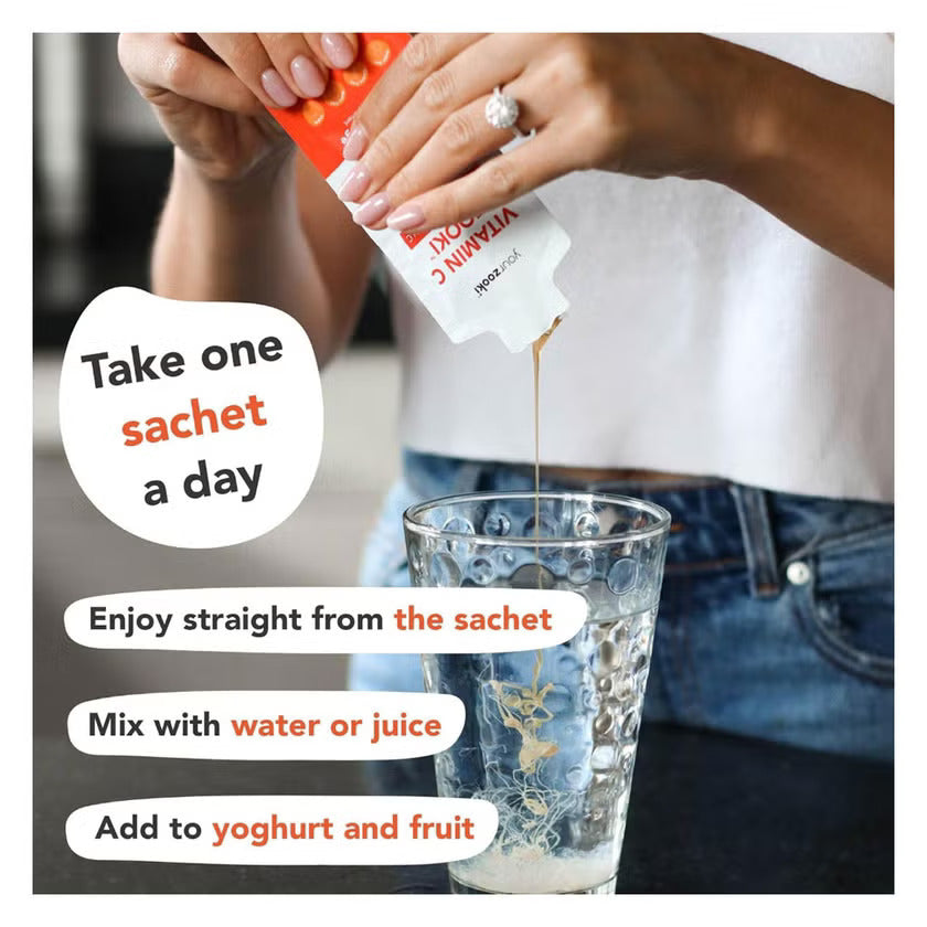 Zooki Liposomal Vitamin C liquid sachet delivers 1000mg of vitamin C, encapsulated in liposomes for up to 4x higher absorption compared to standard Vitamin C supplements. This advanced delivery system ensures efficient uptake into the bloodstream, maximizing benefits for immune health, energy levels, and collagen synthesis. It’s needed to produce and regulate stress hormones and helps virtually every major organ in the body function properly. It’s needed to get blood into muscles when you’re exercising and to keep viruses or bacteria away when you’re travelling. Vitamin C Zooki is infused with real fruit extracts and comes in two delicious flavours. The convenient, great-tasting citrus orange sachets are sugar-free, vegan-friendly, and free from gluten, dairy, and soy, making them suitable for various dietary needs.