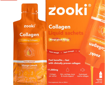 Zooki Super Strength Marine Collagen delivers 11,000mg of pure marine collagen per 18.5ml liquid sachet, designed to support skin elasticity, joint health, and overall vitality. With a refreshing mango peach flavor, this pack of 14 sachets offers a convenient and potent daily boost of collagen, promoting natural beauty and wellness with easy absorption and high bioavailability. Ideal for those seeking expert-grade supplementation for healthier skin and connective tissue maintenance.