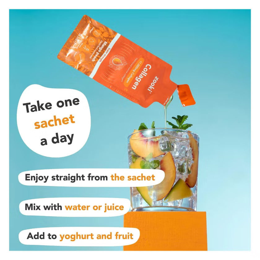 Zooki Super Strength Marine Collagen 11000mg Mango Peach Flavor Liquid Sachets 18.5ml, Pack of 14's